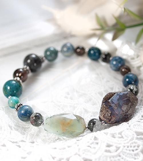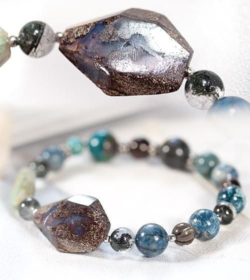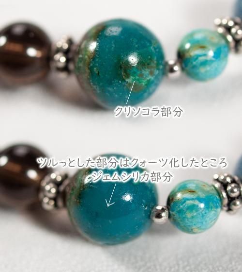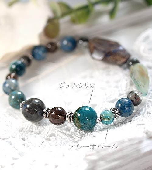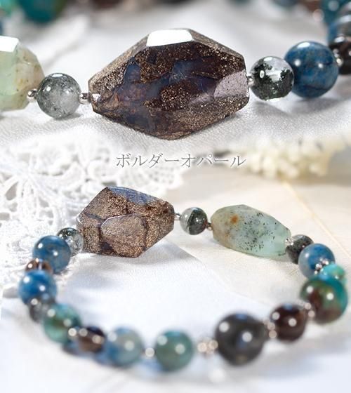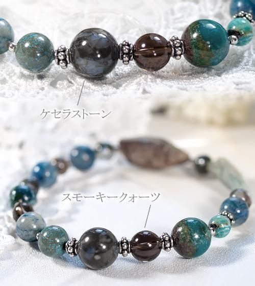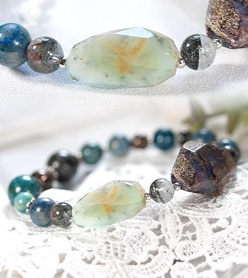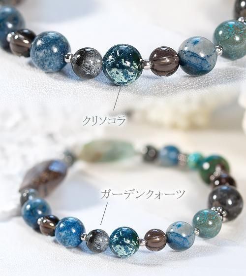 またケセラストーンはブルー部分が内包されたものを厳選しました。その他鮮やかなペルー産ブルーオパール、透明感のあるスモーキークォーツ、モスグリーンの内包物が個性的なガーデンクォーツ、そして自然の模様が魅力のクリソコラを組み合わせています。