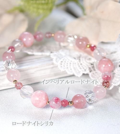 その他、石英に内包されたピンクが個性的な新しいタイプのロードナイトシリカ、カットが美しく発色が鮮やかなインペリアルロードナイト、そして濃いピンクが愛らしいピンクエピドートを組み合わせました。女性の可愛らしさと美しさを存分に引き出すパワーブレスレットです。