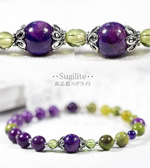 こちらはセンターに発色の大変美しいレア品質のスギライト8mm、サイドにも小さくて可愛い4mmのSA品質を使用した高品質ブレスレットです。