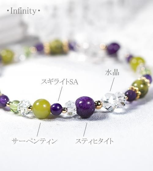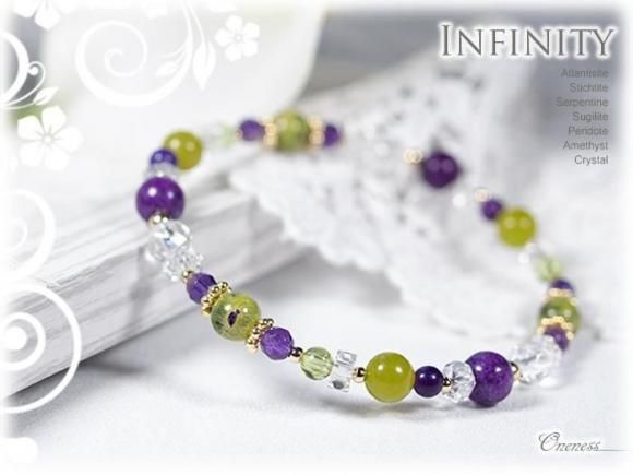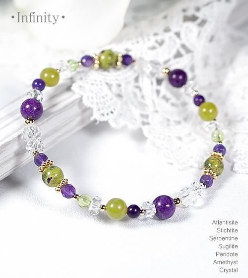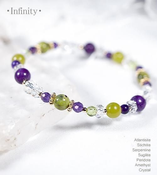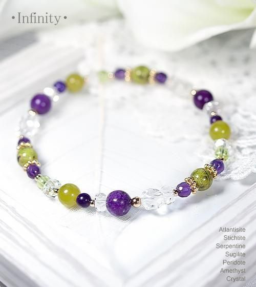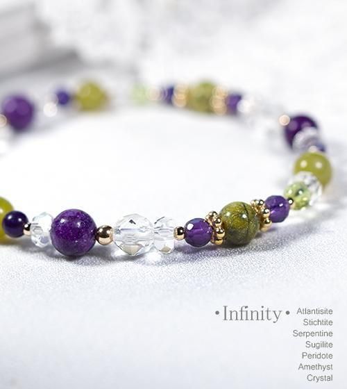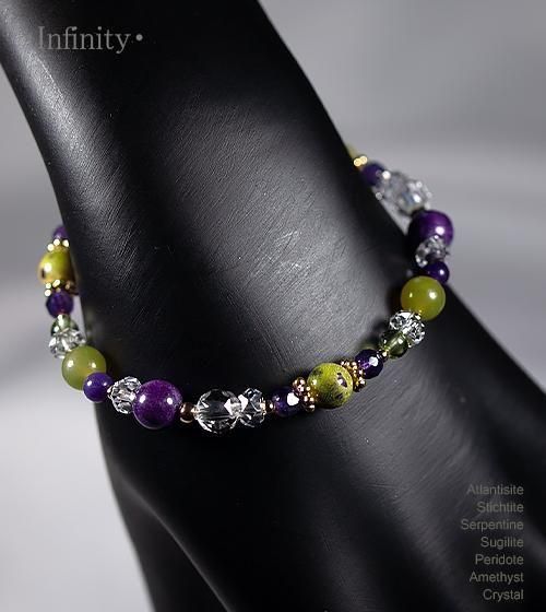 こちらはアトランティサイト3石とスティヒタイト3石、サーペンティン3石、最高品質SAのスギライト4mm3石を中心に、ペリドットとアメジスト、水晶を組み合わせたデザインブレスレットです。
