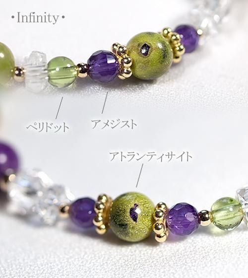 その他透明感の高いペリドット、アメジストと水晶を合わせました。全体的にエキゾチックで神秘的でありながら、透明感のある軽さも感じていただけるデザインブレスレットです。