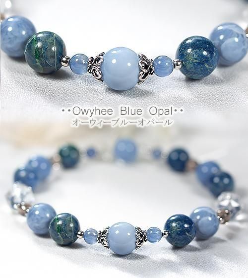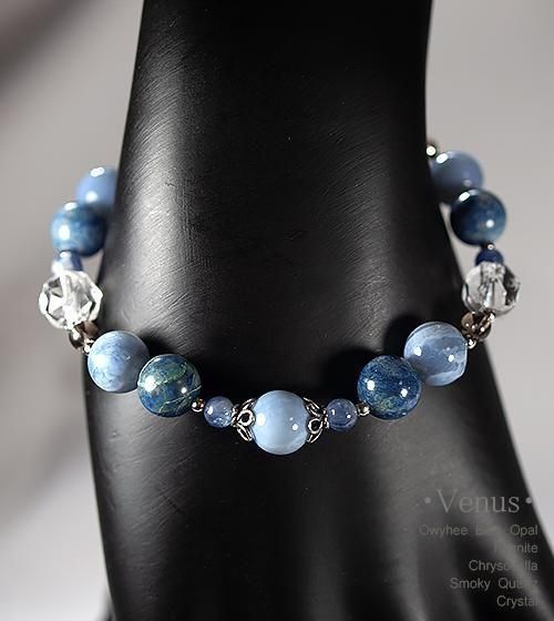 こちらは近年注目を集める、アメリカ・オレゴン州のオーウィーブルーオパールと南アフリカ産クリソコラ、小さな青いカイヤナイト、スモーキークォーツ、美しく輝くカット水晶を合わせたデザインブレスレットです。